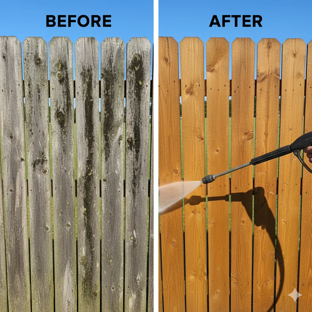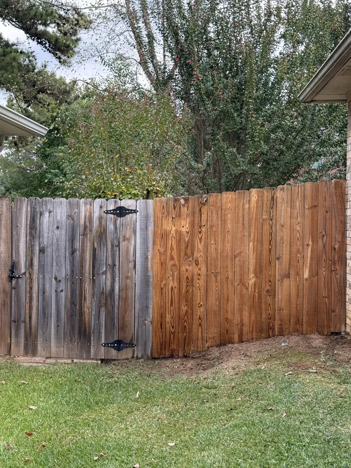 We pressure wash or soft wash your fence to remove years of grime, mildew, and gray oxidation.